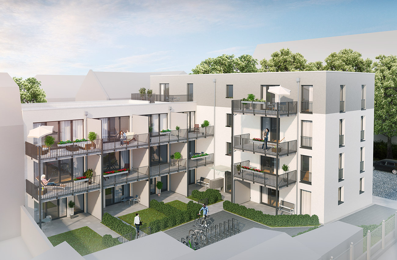 Die neue teilweise viergeschossige Wohnanlage im Nürnberger Westen bietet ansprechendes Wohnen auf kleinem Rau. Die ca. 25 m² großen Apartments verfügen über eigene Balkone und die Erdgeschosswohnungen sogar über kleine Gärten. Das moderne Wohngebäude mit Flachdach besticht durch seine ansprechende Architektur und bietet seinen Bewohnern viel Freiheit auf kleinem Raum. Das Gebäude wurd 2016 fertiggestellt.